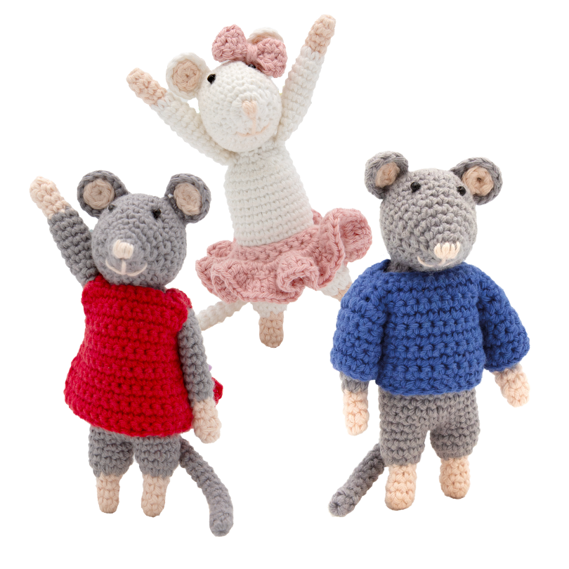Crochet your favourite mouse! A complete kit with pattern, step-by-step instructions, yarn, stuffing, and much more. Can't choose between Sam, Julia, and Ella? Crochet them all and get a great discount!